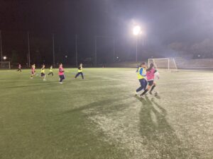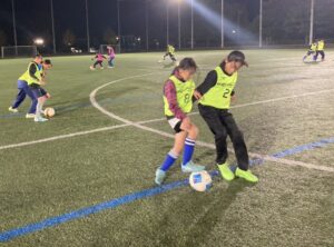 ボールを使ったウォーミングアップを行った後、パス練習、シュート練習などを行いゲームを行いました。積極的なプレーが多く、果敢にゴールを目指す姿がたくさん見られました。