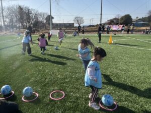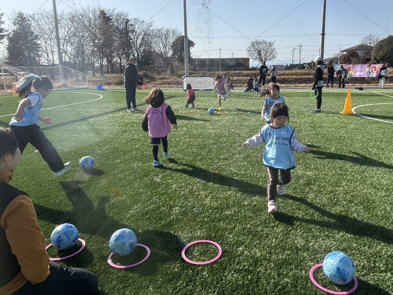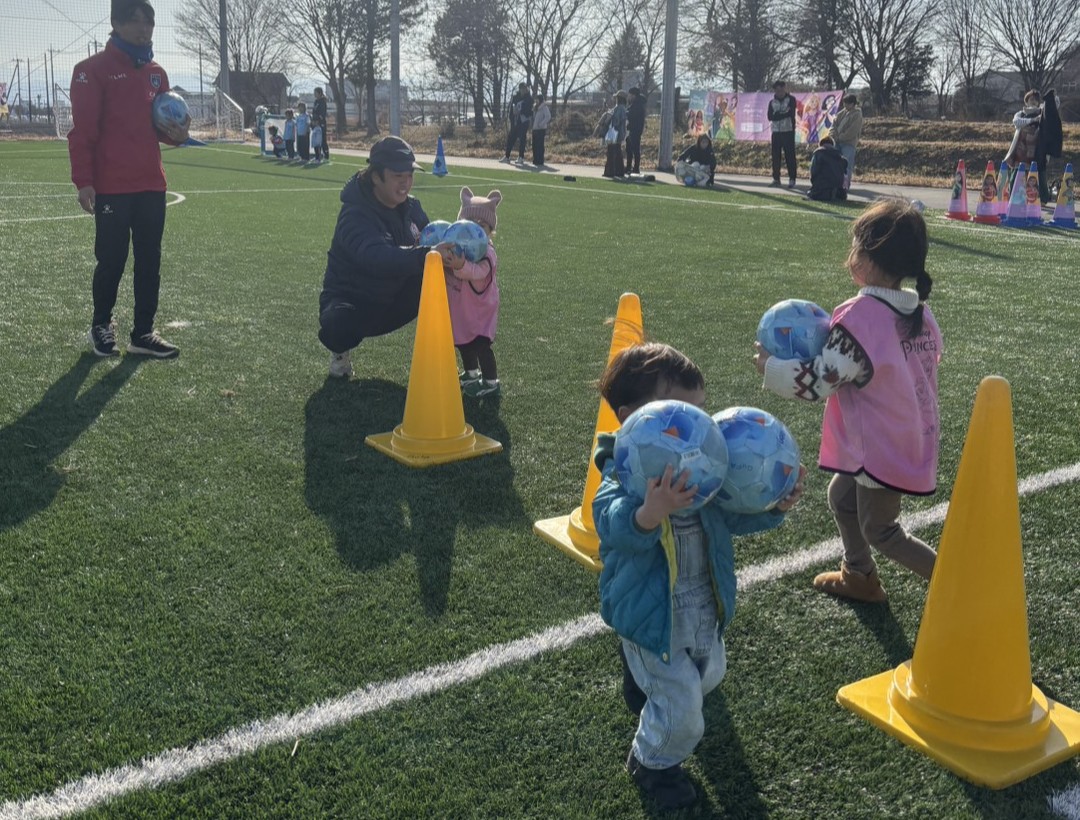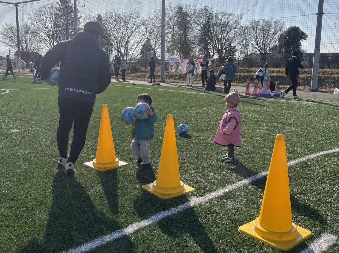 当日は、12名(小学生2名、未就学児10名)のご参加をいただきました。風が強く吹いておりましたが、寒さを吹き飛ばすくらい元気な様子でボールを追いかけ、蹴っている姿がたくさん見られました。